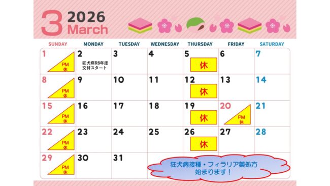 まだまだ寒い時期が続きますが、春がもうすぐですね! 3月の営業カレンダーです🌸 わんちゃんたちについては 3月2日(月)から狂犬病R8年度鑑札・済票の交付が始まります💉 またフィラリアの予防開始も4月末から…